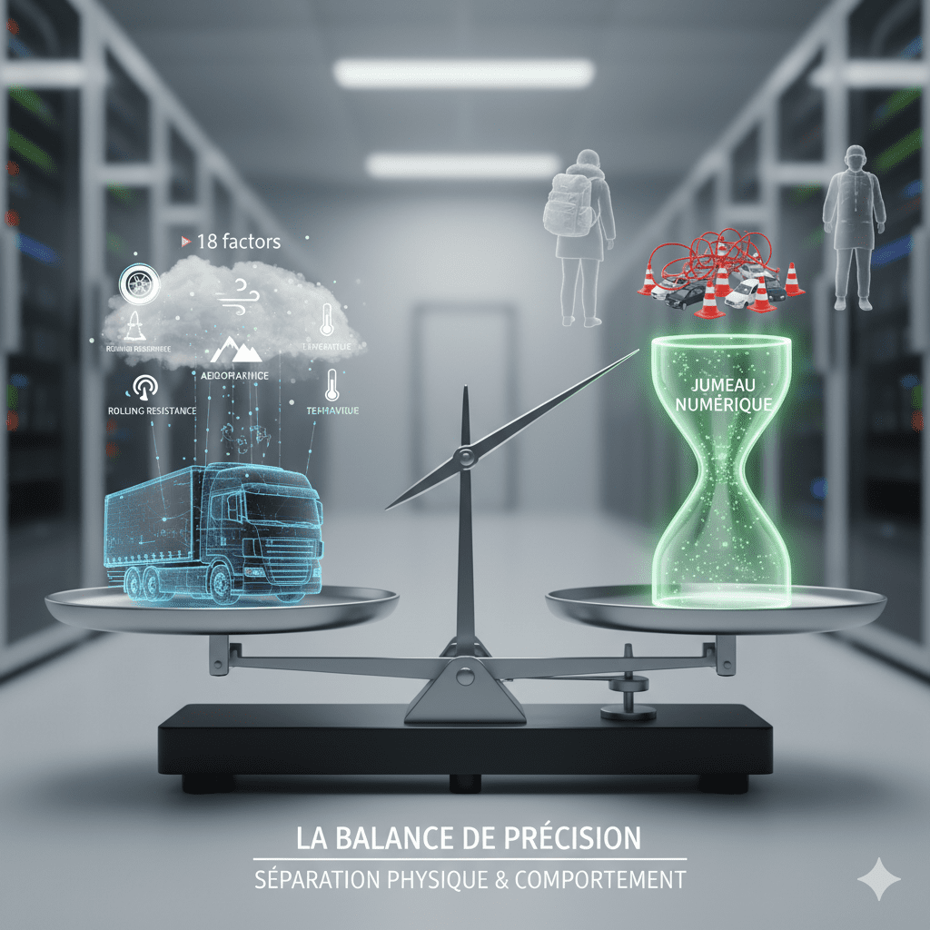 Notre Jumeau Numérique résout ce problème fondamental. C'est une balance de précision conçue pour "peser" la consommation du véhicule en séparant méthodiquement ce qui relève de la physique pure (votre "poids corporel") de ce qui relève du comportement du chauffeur (le "poids des vêtements").